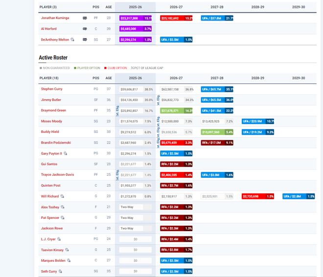 NBA歷史上還沒有以4位35歲以上球星為核心奪冠的先例。勇士在續(xù)約庫明加時做了薪金上的讓步,造成的一大后果就是,球隊現(xiàn)在沒法直接給小庫里一份底薪合同。勇士續(xù)約庫明加之后,僅剩200萬美元的空間,無法用老將底薪(229.6萬美元)簽人。